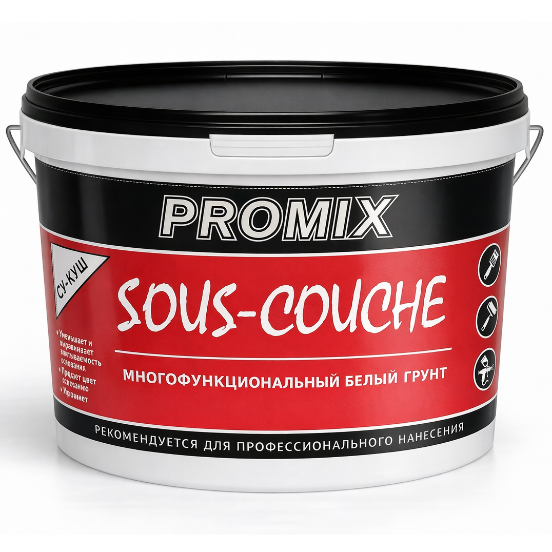 Назначение: грунт многофункциональный СУ-КУШ PROMIX предназначен для окраски большинства видов минеральных поверхностей (стен и потолков) в сухих и средней влажности помещениях (гипсокартонных, бетонных, оштукатуренных и т.д.) перед нанесением на них основного слоя защитно-декоративного покрытия, а также для консервации штукатурки фасадов зданий на зиму. Для наружных и внутренних работ.