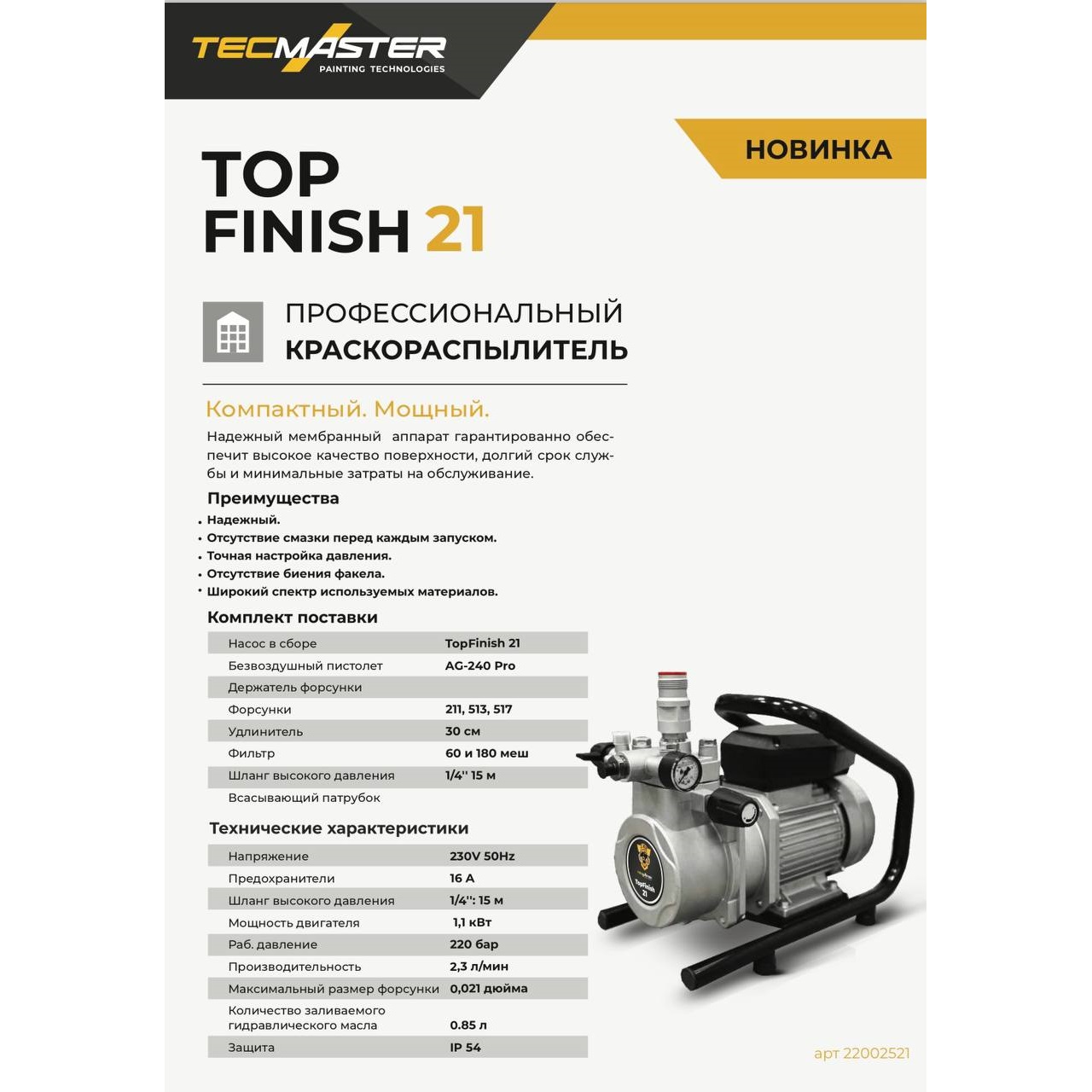 Безвоздушный мембранный окрасочный аппарат TECMASTER TOP FINISH 21 – надежный мембранный аппарат гарантированно обеспечит высокое качество поверхности, долгий срок службы и минимальные затраты на обслуживание.